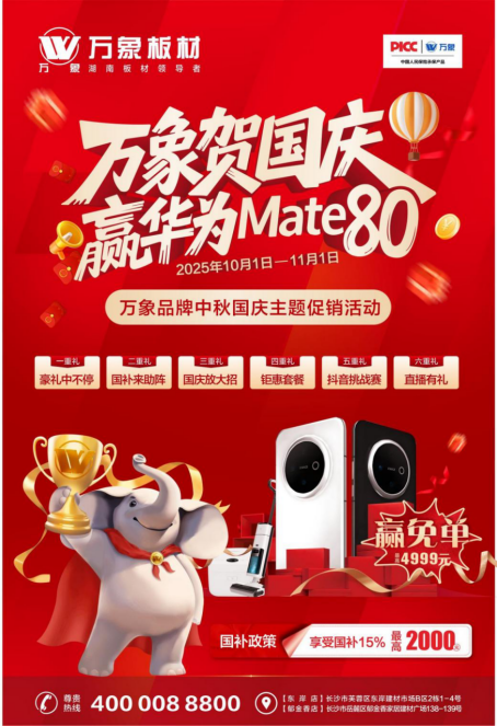 金秋十月,中秋國慶雙節(jié)疊加,家居消費(fèi)市場熱潮涌動,各品牌紛紛加碼營銷釋放福利。在此競爭格局下,旺德府集團(tuán)作為湖南家居建材領(lǐng)軍、全國行業(yè)的知名企業(yè),秉承“為千萬客戶創(chuàng)享美好健康環(huán)境”的企業(yè)愿景,傾力整合旗下兩大核心品牌——萬象板材與萬象天冠高端衣柜定制,拿出滿滿誠意讓利客戶!堅(jiān)守品質(zhì)初心,實(shí)力回饋客戶,于10月1日至11月1日開展“萬象賀國慶 贏華為 Mate80” 雙節(jié)促銷活動,以“真品質(zhì)+真優(yōu)惠”為全國的消費(fèi)者朋友們打造綠色家居方案,彰顯頭部品牌責(zé)任與擔(dān)當(dāng)。