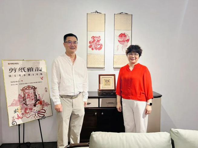 王克會(huì)長(zhǎng)和黎國(guó)開總經(jīng)理在廣東剪紙(國(guó)家級(jí)非遺項(xiàng)目)傳承人饒寶蓮作品留影
