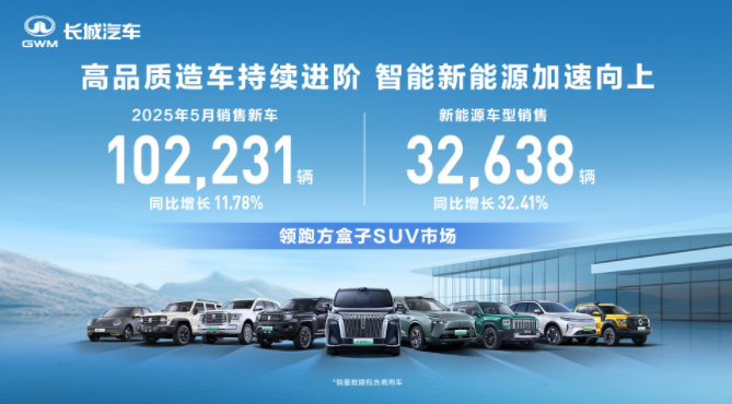 6月1日,長(zhǎng)城汽車(chē)股份有限公司(股票代碼:601633.SH,02333.HK,82333.HK;以下簡(jiǎn)稱(chēng)“長(zhǎng)城汽車(chē)”)發(fā)布2025年5月銷(xiāo)量數(shù)據(jù)。5月,長(zhǎng)城汽車(chē)銷(xiāo)售新車(chē)102,231輛,同比增長(zhǎng)11.78%;20萬(wàn)元以上車(chē)型銷(xiāo)售29,839輛,同比增長(zhǎng)24.67%;新能源車(chē)型銷(xiāo)售32,638輛,同比增長(zhǎng)32.41%;方盒子車(chē)型銷(xiāo)售43,724輛,同比增長(zhǎng)28.27%,位列方盒子SUV銷(xiāo)量第一。