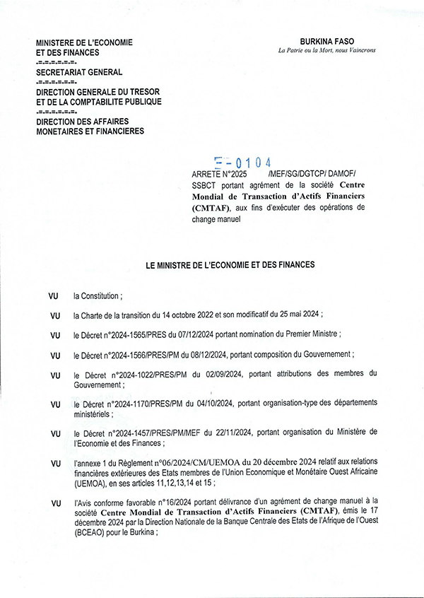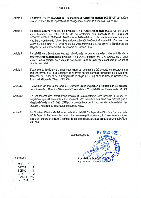 截止2024年12月,經(jīng)布基納法索國(guó)家經(jīng)濟(jì)和財(cái)政部、國(guó)家安全部及其下設(shè)各機(jī)構(gòu)的審核,世界金融資產(chǎn)交易中心(CMTAF)順利將關(guān)于個(gè)人換匯許可法令的材料遞交到西非經(jīng)濟(jì)和貨幣聯(lián)盟(UEMOA),并于當(dāng)月通過(guò)聯(lián)盟審核。目前,該文件已順利獲得西非經(jīng)濟(jì)和貨幣聯(lián)盟下設(shè)的西非國(guó)家中央銀行(BCEAO)的頒發(fā),并順利得到布基納法索國(guó)家經(jīng)濟(jì)和財(cái)政部簽批。